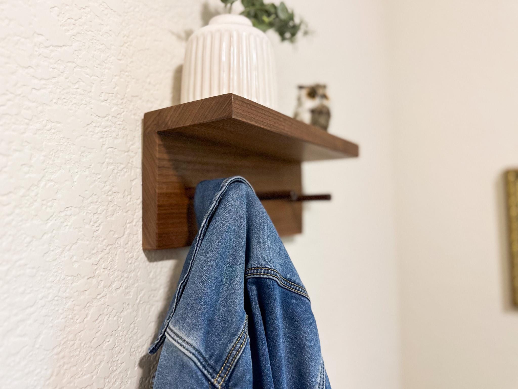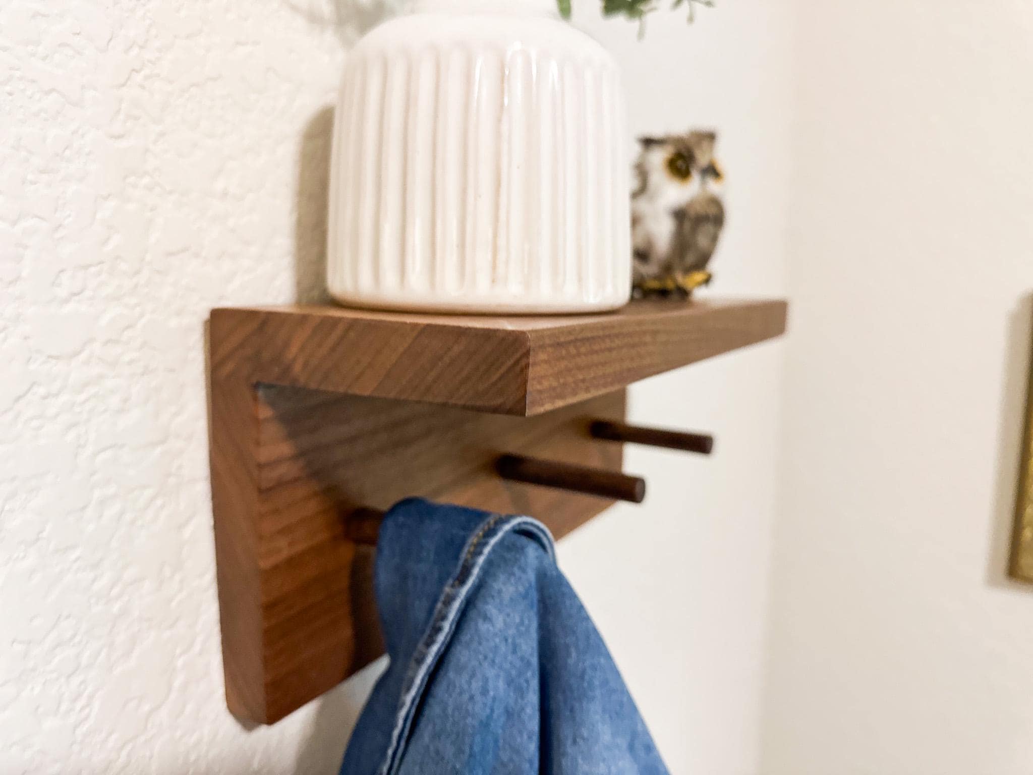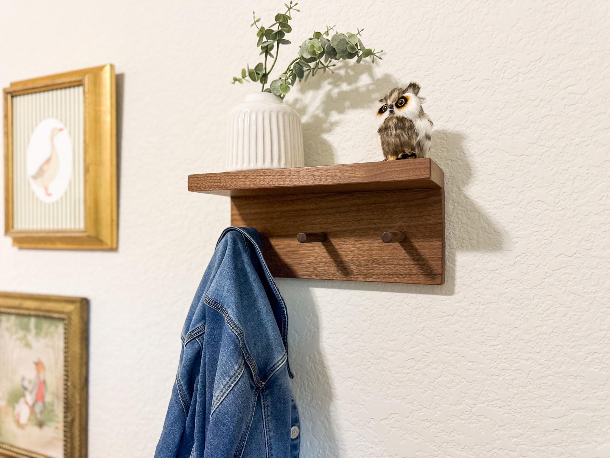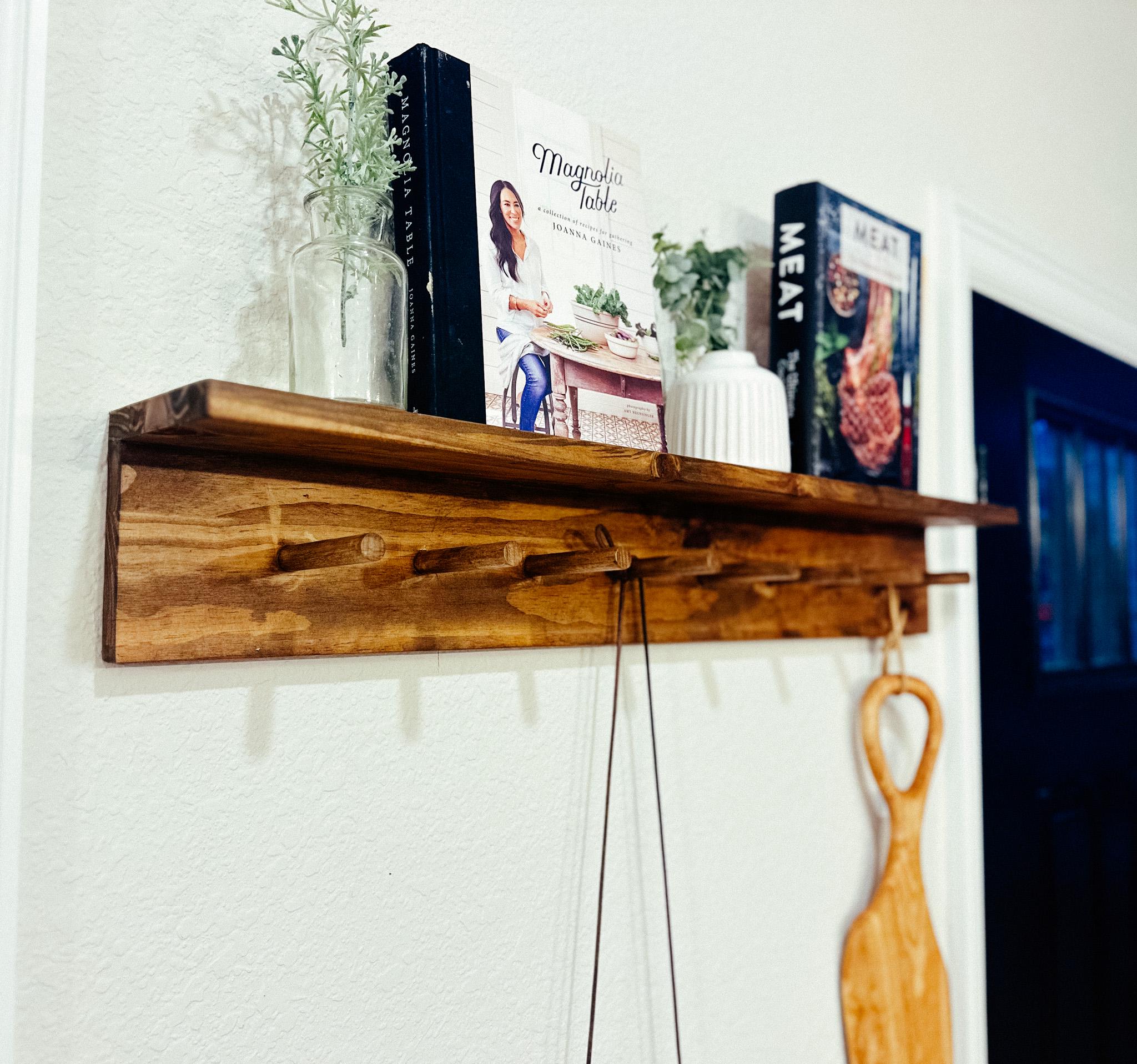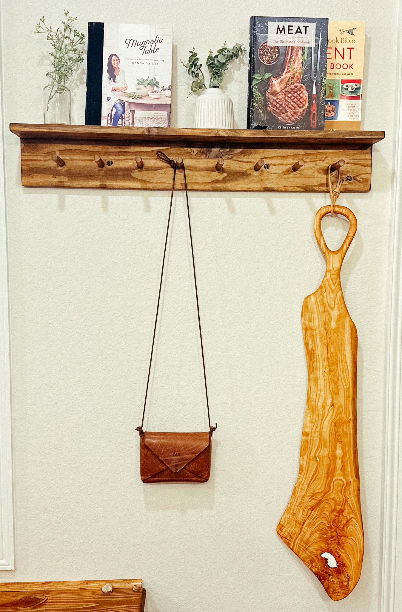 solid walnut or white oak peg board shelves. Many sizes to choose from to fit your home's needs. All shelves are made and shaped 100% by hand in my wood shop, and are covered in worship and prayer throughout the build process. Every piece designed and crafted will include a prayer on the back for each specific customer/family. These are built to last from high quality top-end hard wood. Please Note: The long shelf pictured is made from pine, and is not available. It is only used as an example of the size differences in shelves. ALL SHELVES COME IN EITHER NATURAL WHITE OAK OR WALNUT.